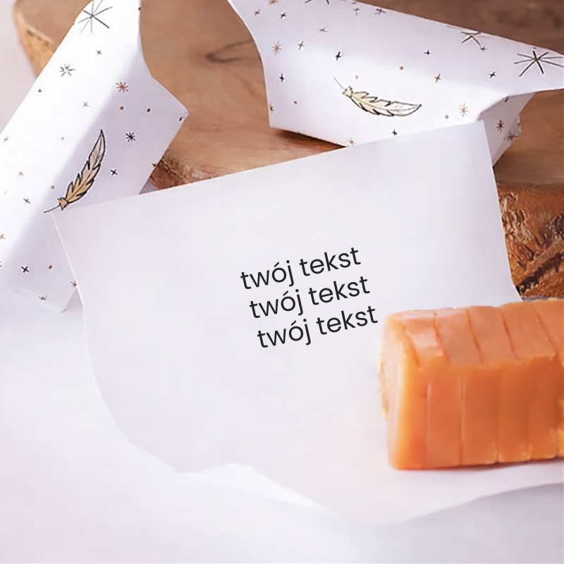 Nadruk wewnętrzny polega na umieszczeniu krótkiego, indywidualnego tekstu po wewnętrznej stronie papierka krówki. Może to być podziękowanie, imię, data, cytat, kilka ciepłych słów lub zabawna wiadomość. Taki detal sprawia, że obdarowana osoba odkrywa niespodziankę dopiero w momencie rozwinięcia cukierka.