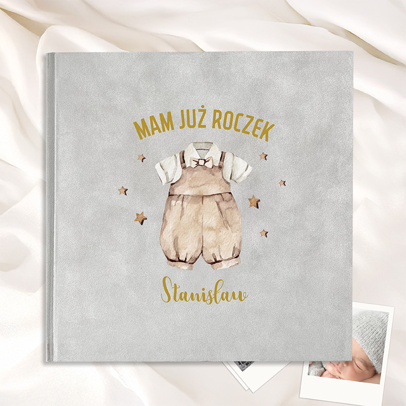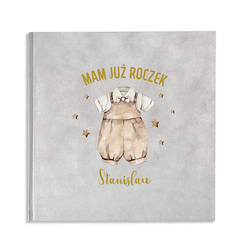 Miękka welurowa oprawa nadaje całości subtelny, klasyczny wygląd. Na okładce znajduje się ilustracja dziecięcego ubranka w beżowym odcieniu, otoczona delikatnymi gwiazdkami, a także elegancki napis „Mam już roczek” i imię dziecka. To właśnie ta personalizacja czyni album osobistą pamiątką. W środku umieszczono białe karty przekładane półpergaminem – idealne do wklejania zdjęć, zapisywania wspomnień i życzeń. Ten welurowy album na roczek to nie tylko piękny prezent, ale także miejsce, w którym można zatrzymać najcenniejsze momenty z pierwszego roku życia.