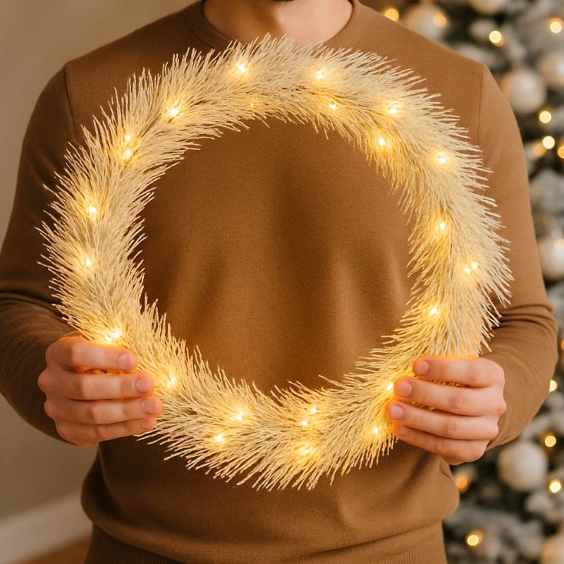 Wianek został wykonany z gałązek w kolorze bieli. Między gałązkami rozmieszczono drobne diody LED emitujące ciepłe światło. Jego uniwersalna forma sprawia, że możesz zawiesić go na drzwiach, ścianie, nad kominkiem lub w oknie. Świetnie sprawdzi się także jako centralny punkt dekoracyjny na stole, tworząc elegancką bazę pod świecę lub stroik. Dzięki zasilaniu na baterie możesz umieścić go w dowolnym miejscu bez konieczności ukrywania przewodów.