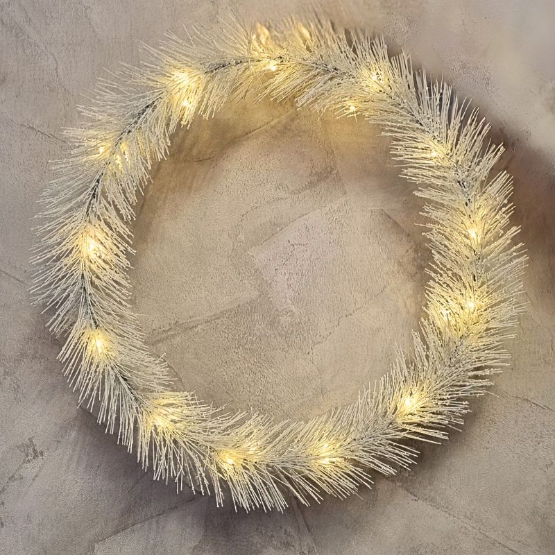 Zimowy wianek świąteczny z oświetleniem LED w białym kolorze to elegancka dekoracja tworząca przytulny klimat. Idealna na drzwi, ścianę lub stół.