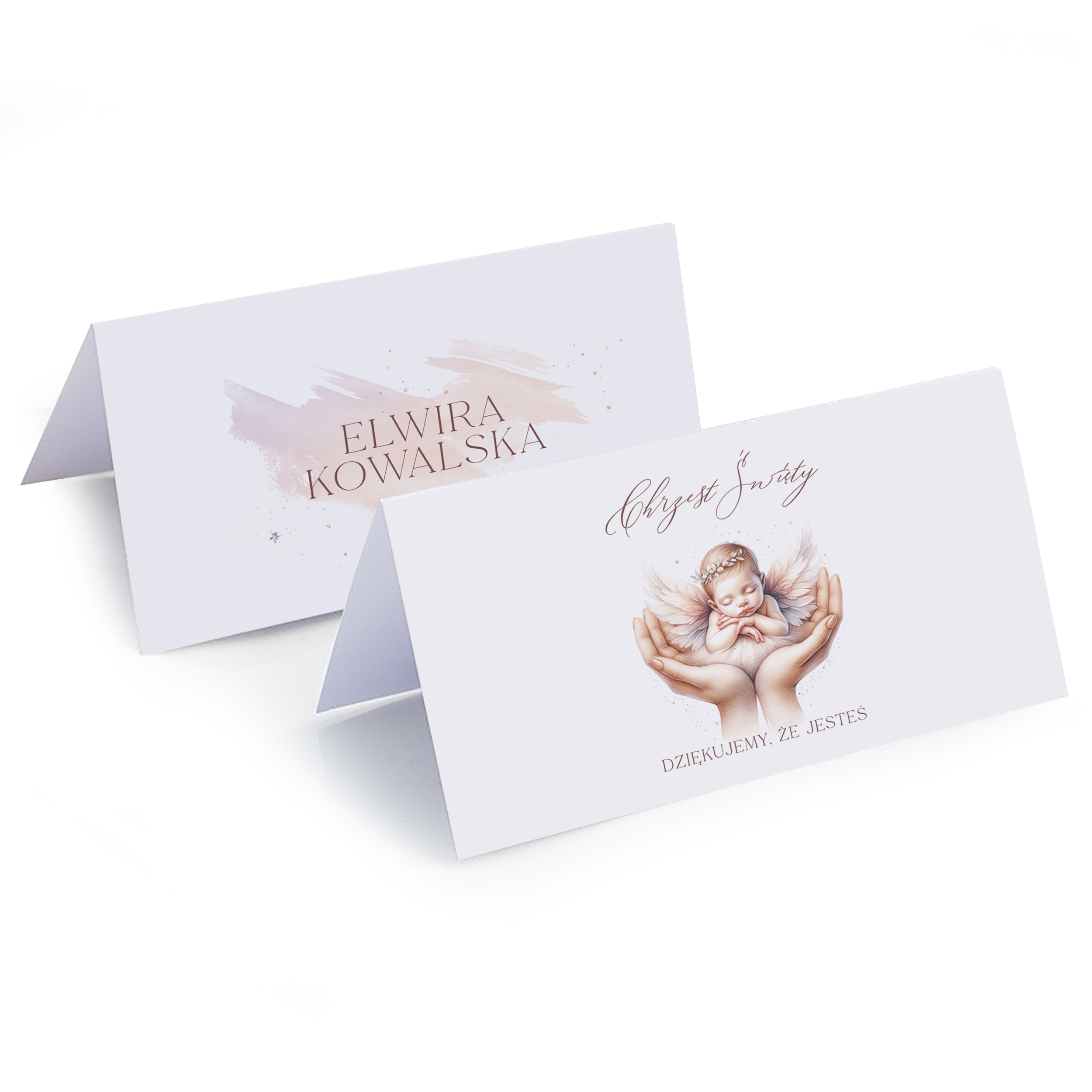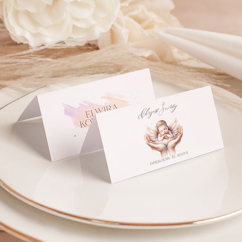 Personalizowana winietka na Chrzest Święty dziewczynki to elegancki sposób na zorganizowanie miejsc przy stole bez zbędnego stresu i chaosu. Dzięki nim każdy gość znajdzie swoje miejsce z łatwością, a całość aranżacji zyska spójny, dopracowany charakter. Ich subtelny projekt z motywem aniołka – śpiącego niemowlęcia w delikatnych dłoniach – doskonale wpisuje się w estetykę tej wyjątkowej uroczystości.