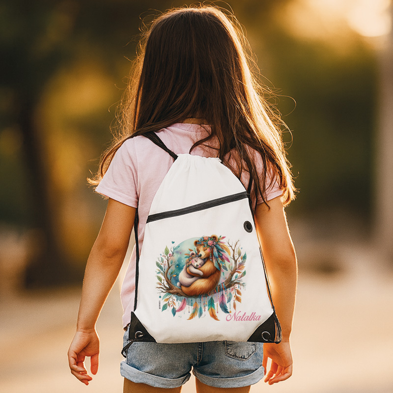 Personalizowany plecak zachwyci swoim niezwykłym wzornictwem. Na przodzie widnieje urocza niedźwiedzica otulająca swojego maluszka. Misie mają na głowach barwne pióropusze z kwiatkami. Siedzą na kolorowej gałęzi pełnej ozdób z piórek. W tle widnieje majestatyczny obraz księżyca. Imię dziecka dodaje indywidualnego charakteru, czyniąc ten worek naprawdę jedynym w swoim rodzaju. Plecak jest wodoodporny, dzięki czemu wszystkie przedmioty będą w nim bezpieczne. Wygodne, regulowane sznurki, kieszonka na zamek i otwór na kabel dodają całości funkcjonalności.