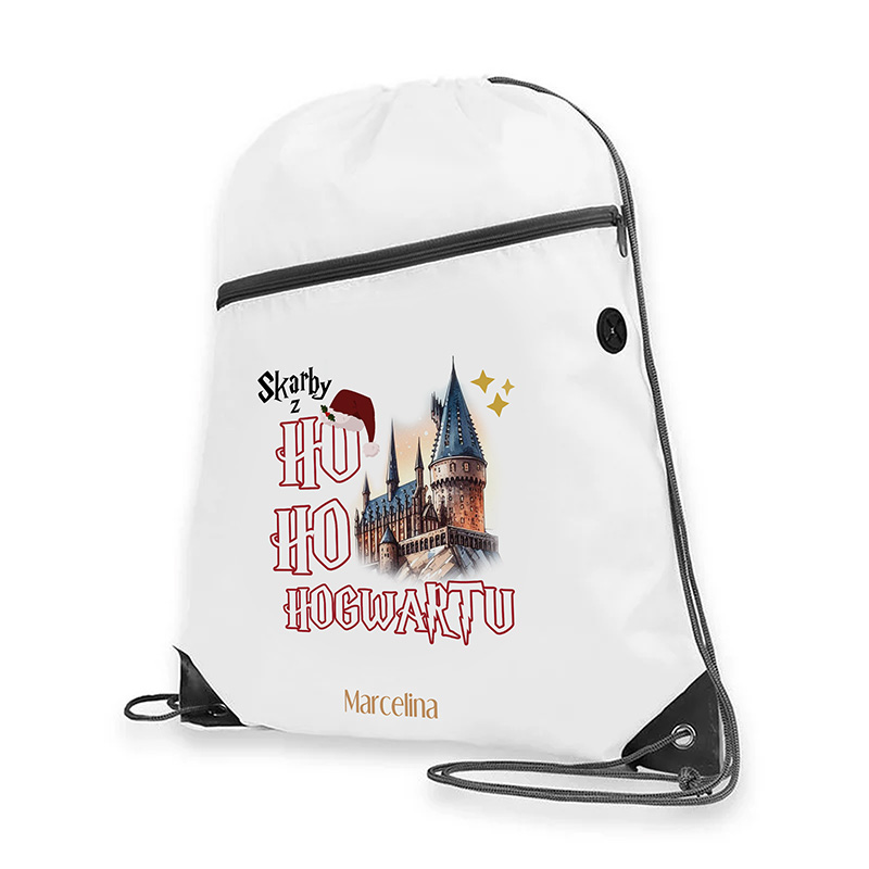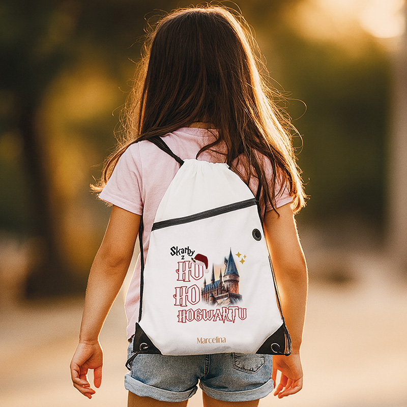 Plecak wykonano z lekkiego, ale wytrzymałego materiału. Idealnie nadaje się do szkoły, na basen, trening, wycieczki szkolne lub po prostu jako codzienna torba na drobiazgi. Worek posiada sznurki, które zamykają od góry worek oraz zapewniają wygodne noszenie na plecach. Dodatkowym atutem jest dodatkowa przednia kieszeń na suwak i otwór na kabel, który przyda się na przykład do powerbanka lub słuchawek. Worek zdobi ilustracja magicznego zamku przypominającego Hogwart, czapka świętego Mikołaja oraz zabawny napis „Skarby z Ho Ho Ho Hogwartu”. Pod grafiką znajduje się personalizacja imieniem obdarowanego dziecka, co czyni prezent wyjątkowym.