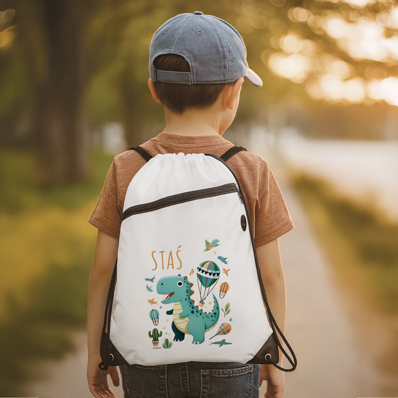 Wodoodporny i materiałowy worek-plecak, personalizowany imieniem to idealny prezent dla każdego małego fana prehistorycznych przygód.