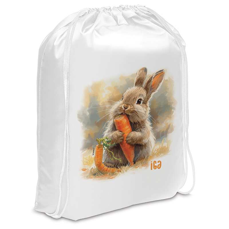 Worek utrzymany jest w jasnej kolorystyce i ozdobiony uroczą ilustracją przedstawiającą króliczka trzymającego marchewkę. Grafika ma ciepły, bajkowy charakter i utrzymana jest w naturalnych, pastelowych barwach, które pięknie wpisują się w wiosenną atmosferę świąt. Na worku znajduje się imię, które podlega personalizacji, dzięki czemu można dopasować produkt do konkretnego dziecka.
