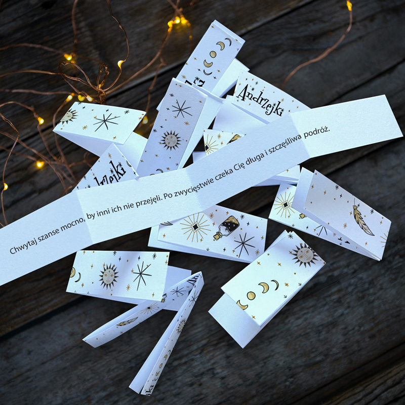 Zestaw zawiera aż 112 karteczek z andrzejkowymi przepowiedniami, wydrukowanymi na papierze z ozdobną grafiką. Karteczki z jednej strony posiadają wróżby, a z drugiej znajduje się motyw księżyca, gwiazd, słońca i magicznych symboli. W środku znajdują się pozytywne przesłania i inspirujące prognozy na przyszłość. Zestaw jest gotowy do użycia i nie wymaga żadnych przygotowań.