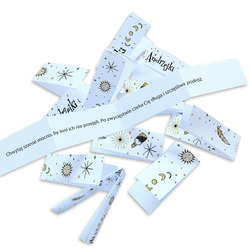 Pakiet karteczek z wróżbami to doskonała atrakcja na szkolne andrzejki, zabawy klasowe, świetlicowe i domowe imprezy. Każdy uczestnik może wylosować swoją wróżbę, dzięki czemu zabawa staje się pełna emocji, śmiechu i magii. Wróżby sprawdzą się również jako dodatek do dekoracji stołu lub element konkursu.