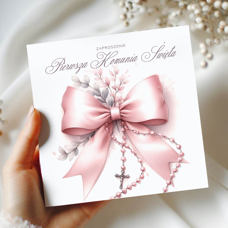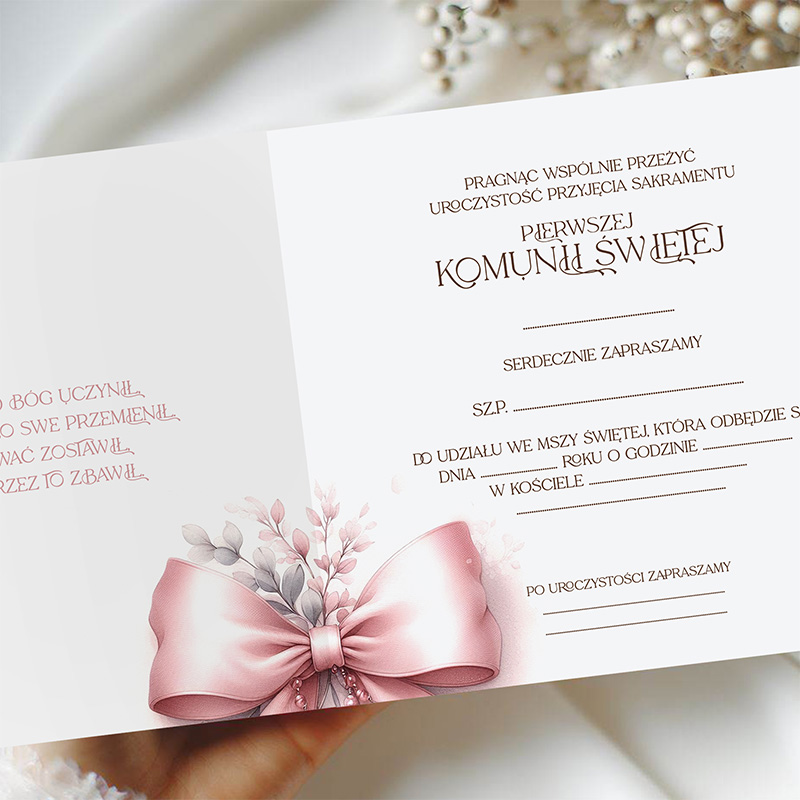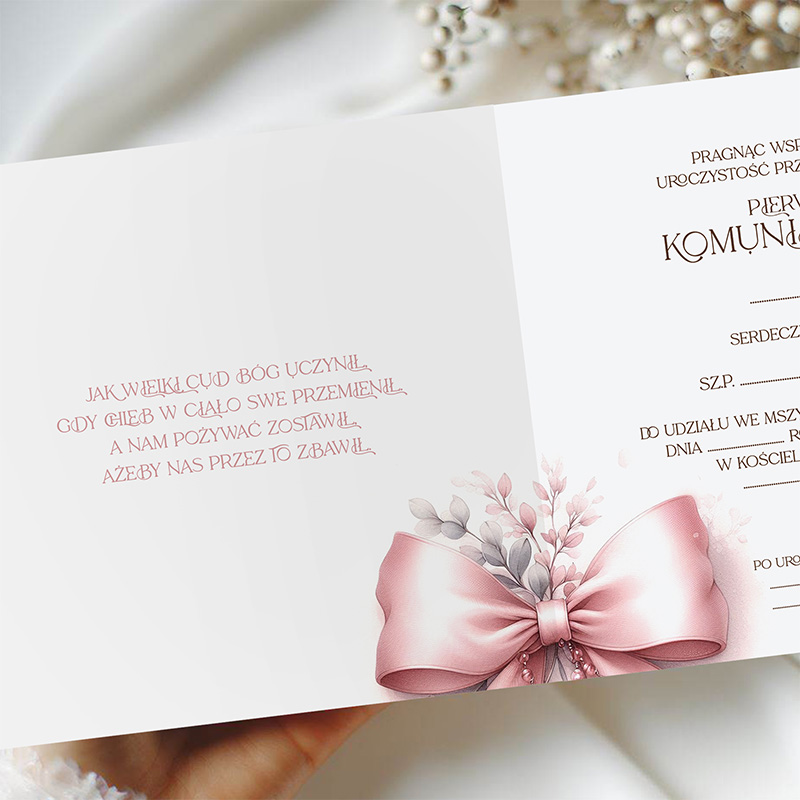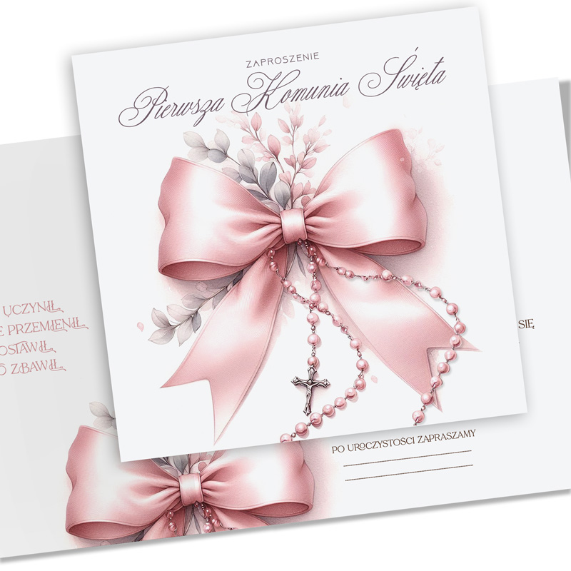 Każde z zaproszeń wykonano na wysokiej jakości papierze. Zaproszenie zdobi ilustracja różowej kokardy, uzupełniona pastelowymi listkami oraz różańcem z krzyżykiem. Całość prezentuje się niezwykle subtelnie. Wnętrze zaproszenia podzielono na dwie części. Po lewej stronie znajduje się cytat religijny, który wprowadza w klimat uroczystości. Po prawej umieszczono formułę zaproszenia z miejscem na ręczne wpisanie imienia i nazwiska zaproszonego gościa, daty, godziny, miejsca Mszy Świętej oraz miejsca przyjęcia.