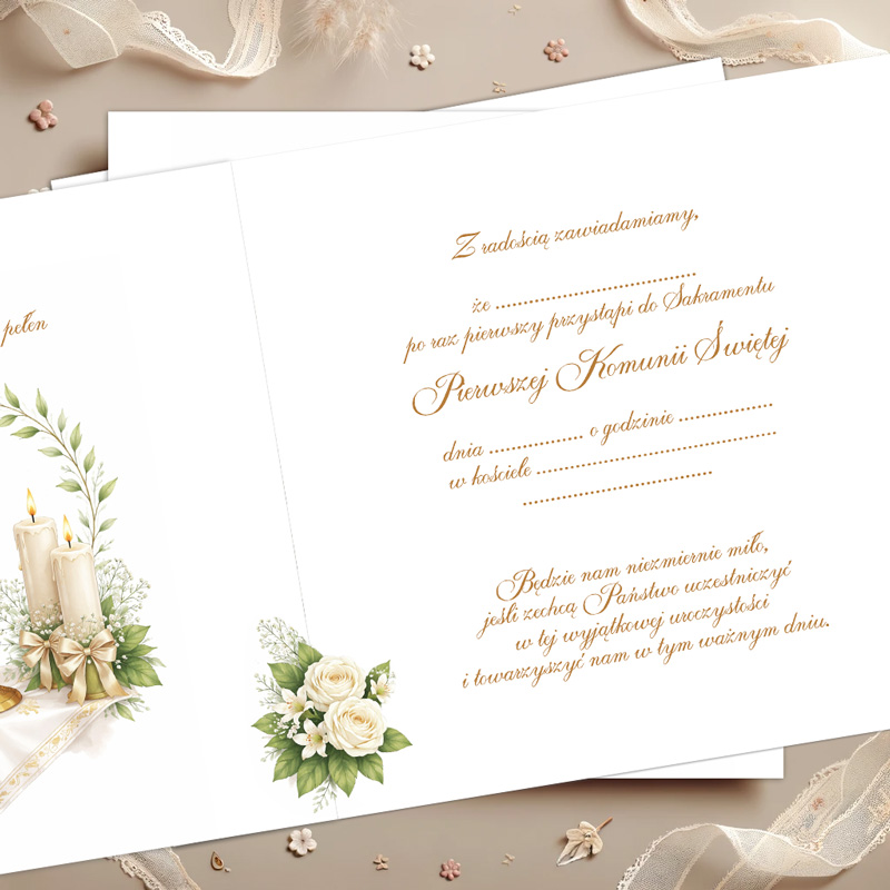 Zawiadomienie idealnie sprawdzi się jako stylowa informacja o nadchodzącej uroczystości komunijnej. To doskonały wybór dla rodziców, którzy chcą w elegancki sposób przekazać bliskim wiadomość o Pierwszej Komunii Świętej dziecka oraz zadbać o spójną oprawę całego wydarzenia.