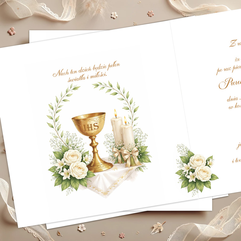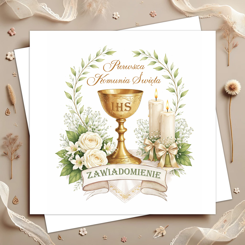 Na froncie znajduje się delikatna, komunijna kompozycja z kielichem eucharystycznym z symbolem IHS, świecami oraz jasnymi kwiatami i zielonymi gałązkami. Całość otoczona jest dekoracyjnym wieńcem roślinnym, który nadaje projektowi lekkości i elegancji. Nad grafiką widnieje napis „Pierwsza Komunia Święta”, natomiast poniżej znajduje się ozdobna wstęga z napisem „Zawiadomienie”, która dopełnia całą kompozycję.