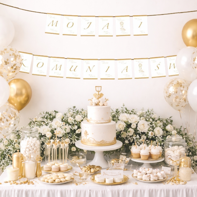 Nadaj przyjęciu komunijnemu wyjątkowego blasku dzięki eleganckiemu zestawowi dekoracji w złotym stylu. To propozycja dla osób, które chcą stworzyć ciepłą, uroczystą atmosferę i zachwycić gości dopracowaną aranżacją już od pierwszego spojrzenia.