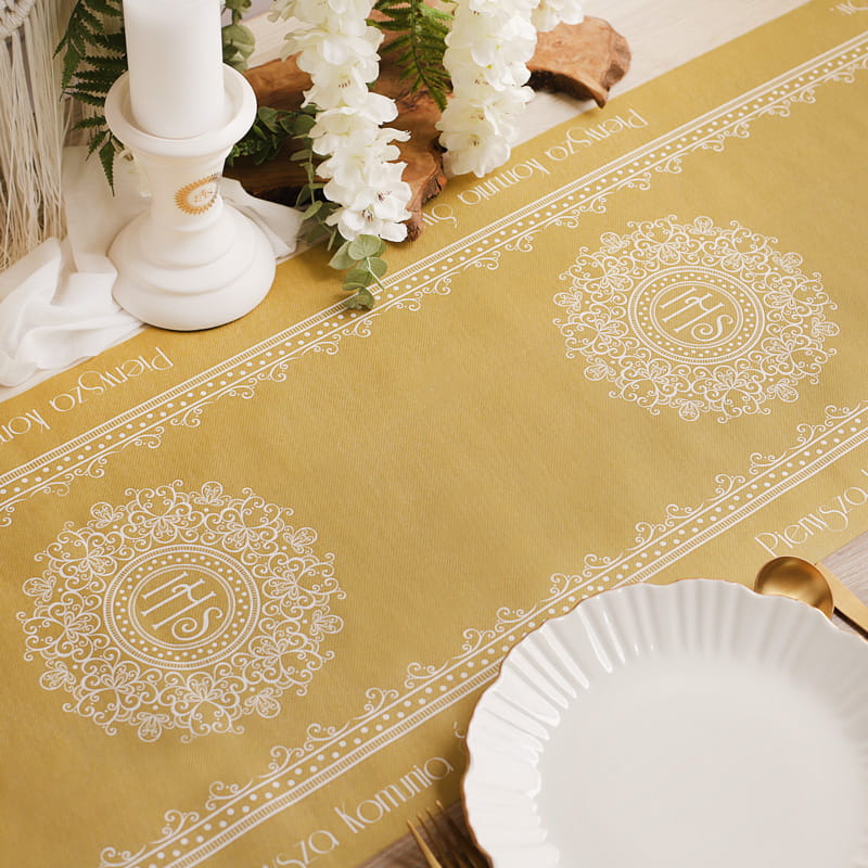 Zestaw zachwyca połączeniem klasycznej bieli ze szlachetnym złotem, tworząc efekt luksusu i ponadczasowej elegancji. Bieżnik z wyrazistym, złotym pasem oraz koronkowymi zdobieniami pięknie eksponuje stół, przyciągając uwagę centralnym motywem IHS. Do kompletu dołączone są stylowe serwetki z delikatnym, komunijnym nadrukiem oraz efektowny baner „Komunia Święta”, który stanowi idealne dopełnienie dekoracji przestrzeni. Całość jest spójna, wyrazista i niezwykle estetyczna.