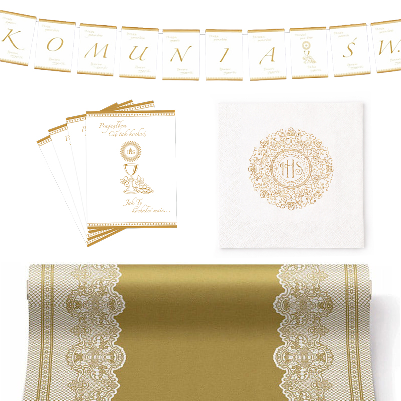 ZESTAW Dekoracje Komunijne Złota Koronka IHS Bieżnik Serwetki Baner