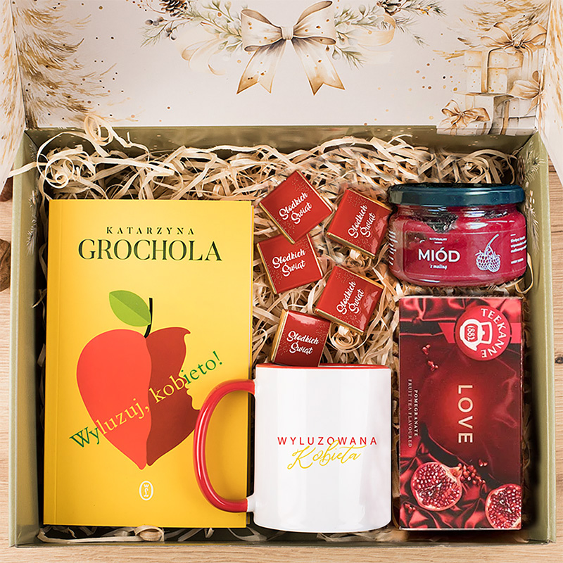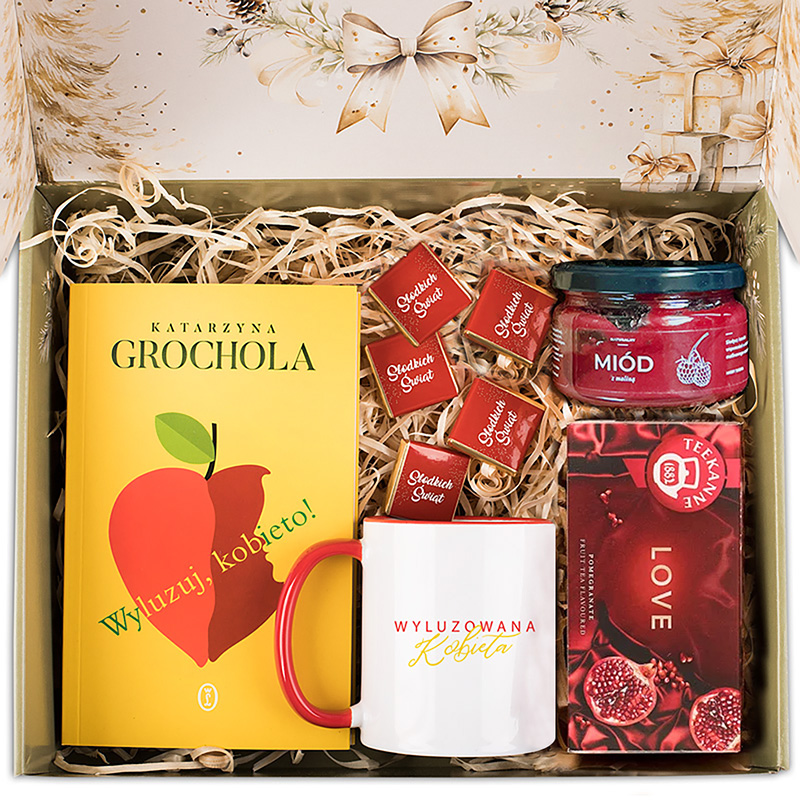 W zestawie znajduje się bestsellerowa książka Katarzyny Grocholi „Wyluzuj, kobieto!”. Tytuł ten trafi w gusta każdej kobiety, która potrzebuje chwili oddechu w codziennym biegu. Do książki dołączono piękny ceramiczny kubek z napisem „Wyluzowana Kobieta”. Zestaw zawiera również herbatę. Dodatkowo znajdziesz tu czekoladki z napisem „Słodkich Świąt”, które doskonale umilą każdą chwilę relaksu, oraz słoik pysznego miodu smakowego.