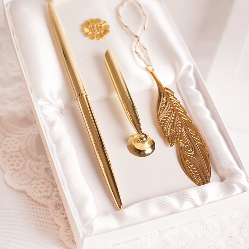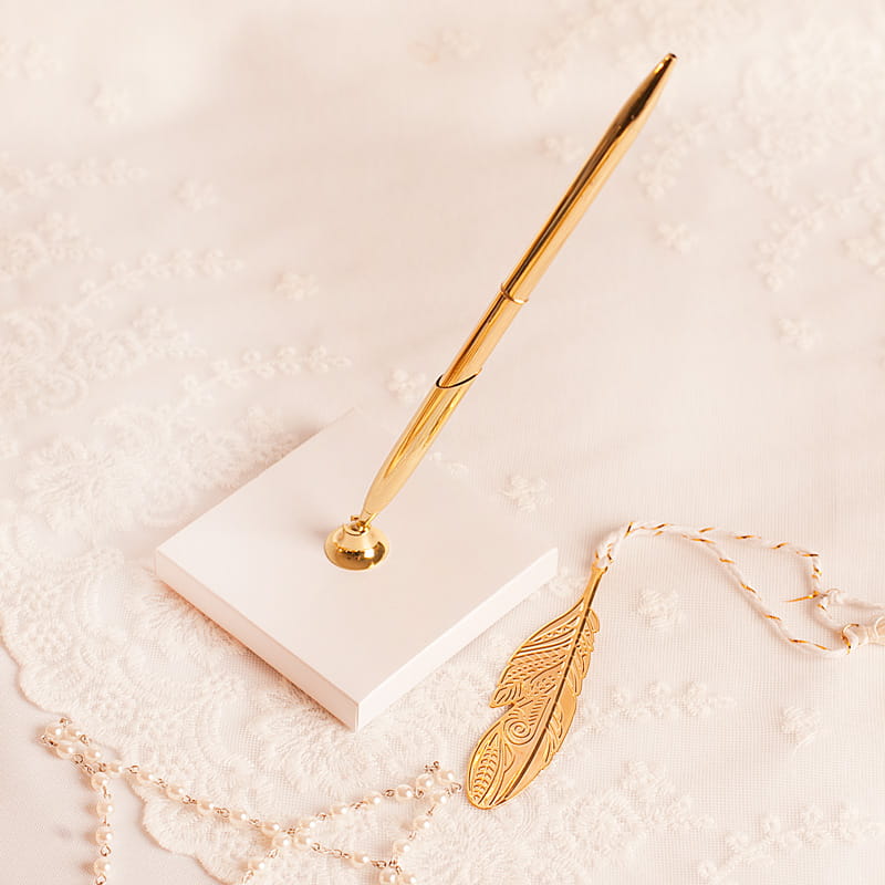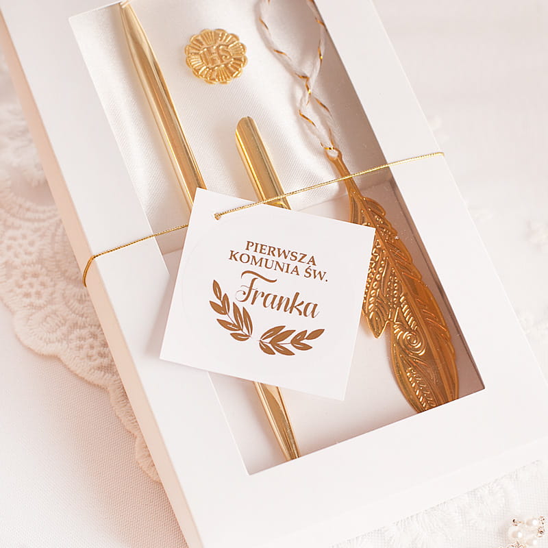 Zestaw zawiera cztery starannie dobrane elementy. Złoty długopis o smukłym, klasycznym kształcie osadzony jest na podstawce, co pozwala na jego estetyczne przechowywanie i użytkowanie. Obok niego znajduje się ozdobna zakładka w kształcie pióra, zawieszona na biało-złotym sznurku – idealna do książki lub modlitewnika. Satynowa chusta, zdobiona złotym symbolem IHS, podkreśla religijny charakter uroczystości. Całość uzupełnia bilecik z personalizacją, który można dołączyć bezpośrednio do opakowania. Wszystkie elementy zostały umieszczone w eleganckim, białym pudełku z przezroczystym wieczkiem, co nadaje prezentowi wyjątkowy charakter.