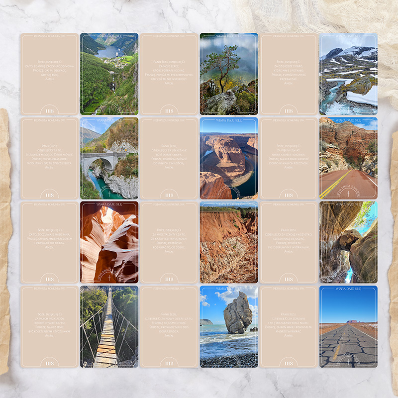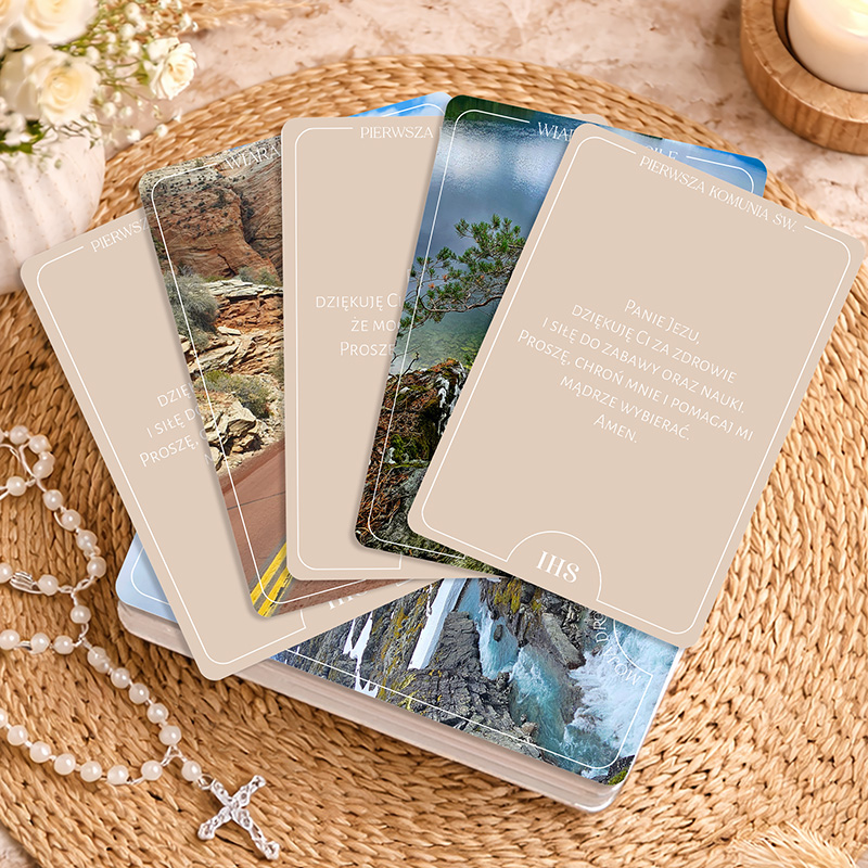 Komplet obejmuje karty z modlitwami opracowanymi specjalnie z myślą o najmłodszych. Zostały one wykonane na solidnym, grubym papierze, co zapewnia trwałość i komfort użytkowania. Delikatnie zaokrąglone brzegi nadają kartom eleganckiego wyglądu. Przód każdej karty zawiera wyraźnie zapisaną modlitwę na jasnym tle oraz symbol IHS, podkreślający sakramentalny charakter zestawu. Tylną stronę zdobią spokojne, naturalne krajobrazy – motywy przyrody sprzyjające wyciszeniu i skupieniu podczas modlitwy. Uzupełnieniem zestawu jest drewniana podstawka z personalizacją imienia dziecka i dedykowanym napisem, która pozwala ustawić karty w widocznym miejscu.
