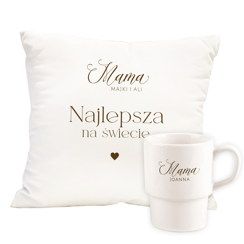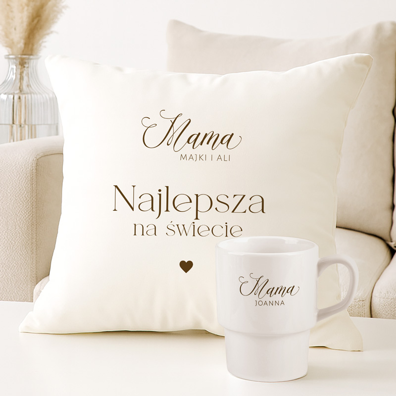 Poduszka utrzymana jest w jasnej, minimalistycznej kolorystyce i ozdobiona napisem „Najlepsza mama na świecie”, pod którym znajduje się subtelne serduszko. Nad głównym napisem umieszczony jest elegancki napis „Mama” wraz z miejscem na personalizację imionami dzieci. Do zestawu dołączony jest stylowy kubek z dopasowanym napisem „Mama”, który również może zostać uzupełniony imieniem. Personalizacja obejmuje imię mamy na kubku oraz podpis nad napisem na poduszce.