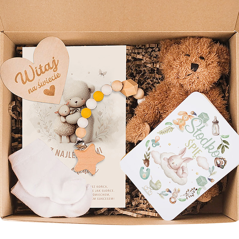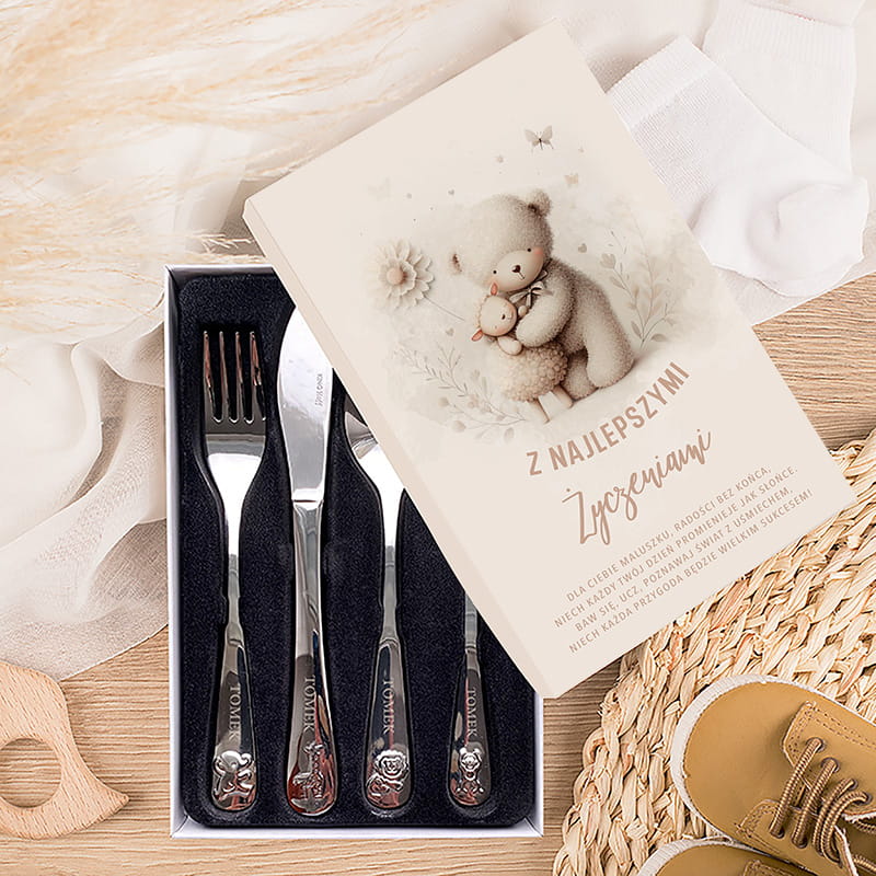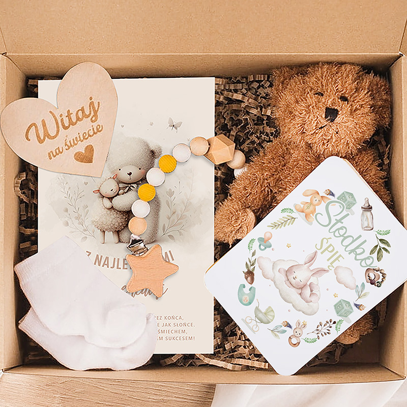 Zestaw powitalny dla noworodka skrywa między innymi personalizowany komplet sztućców z wygrawerowanym imieniem dziecka oraz zwierzątkiem. Składa się on z łyżki, łyżeczki, widelca oraz noża. Znajdziemy tutaj także 12 foto kart. Służą one do wykonywania zdjęć upamiętniających najważniejsze wydarzenia z pierwszego roku życia dziecka. Z ich pomocą uwiecznić można na przykład moment, w którym maluch wypowiedział pierwsze słowo lub po raz pierwszy samodzielnie usiadł. Zestaw dla nowo narodzonego dziecka zawiera również uroczego, miękkiego, pluszowego misia w kolorze brązowym. W jego skład wchodzi także praktyczna zawieszka do smoczka, którą przypina się do dziecięcego ubranka przy pomocy klipsa, chroniąc go w ten sposób przed zgubieniem i spadaniem na ziemię. W pudełku są również białe, bawełniane skarpetki oraz drewniana tabliczka w kształcie serduszka z napisem Witaj na świecie.