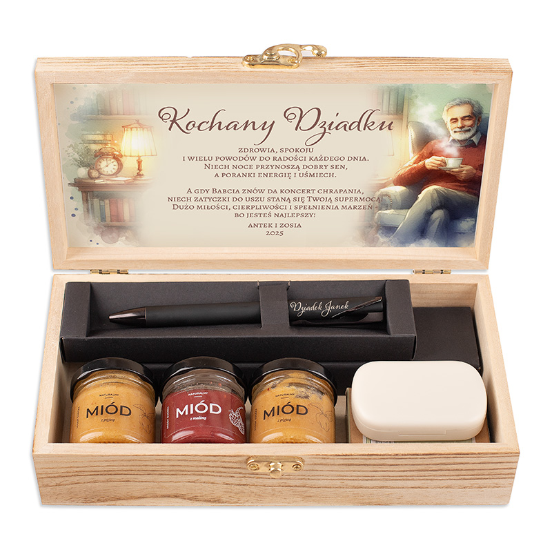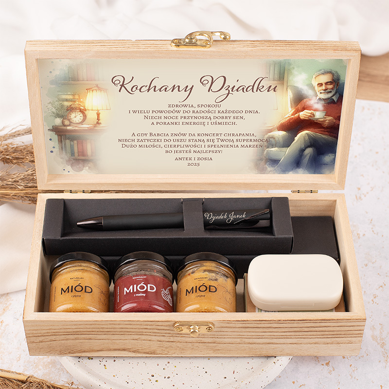 Funkcjonalny i pomysłowy prezent, który przypadnie do gustu każdemu dziadkowi. W zestawie znajdują się trzy smakowe miody, elegancki długopis z grawerem, zatyczki do uszu w etui oraz personalizowana dedykacja z imionami wnuków. To praktyczny i gotowy do wręczenia zestaw na Dzień Dziadka, który łączy słodką przyjemność z użytecznością.