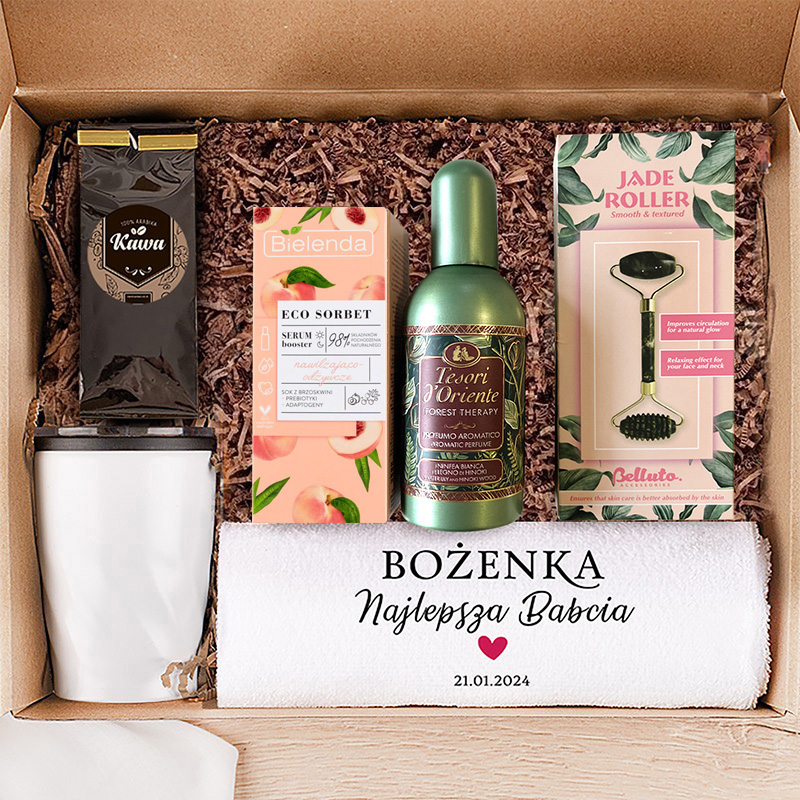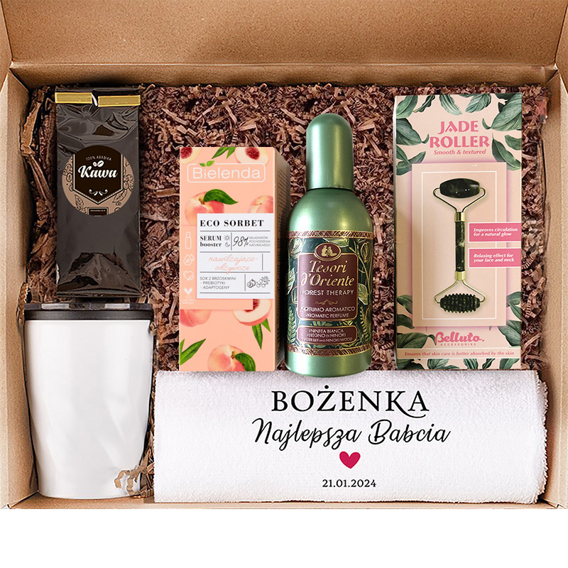 Zestaw ten zawiera wysokiej jakości kosmetyki, które pomogą w codziennej pielęgnacji skóry oraz aromatyczną kawę, idealną na chwile relaksu. Do tego dołączamy elegancki, biały kubek termiczny, który utrzyma odpowiednią temperaturę napojów przez długi czas, niezależnie od pory roku. Ponadto, w zestawie znajdziesz praktyczny ręcznik, na którym umieścimy napis: [Imię] + Kochana Babcia + [Data].
