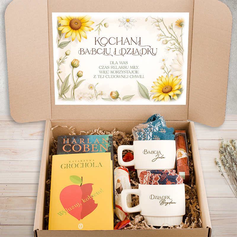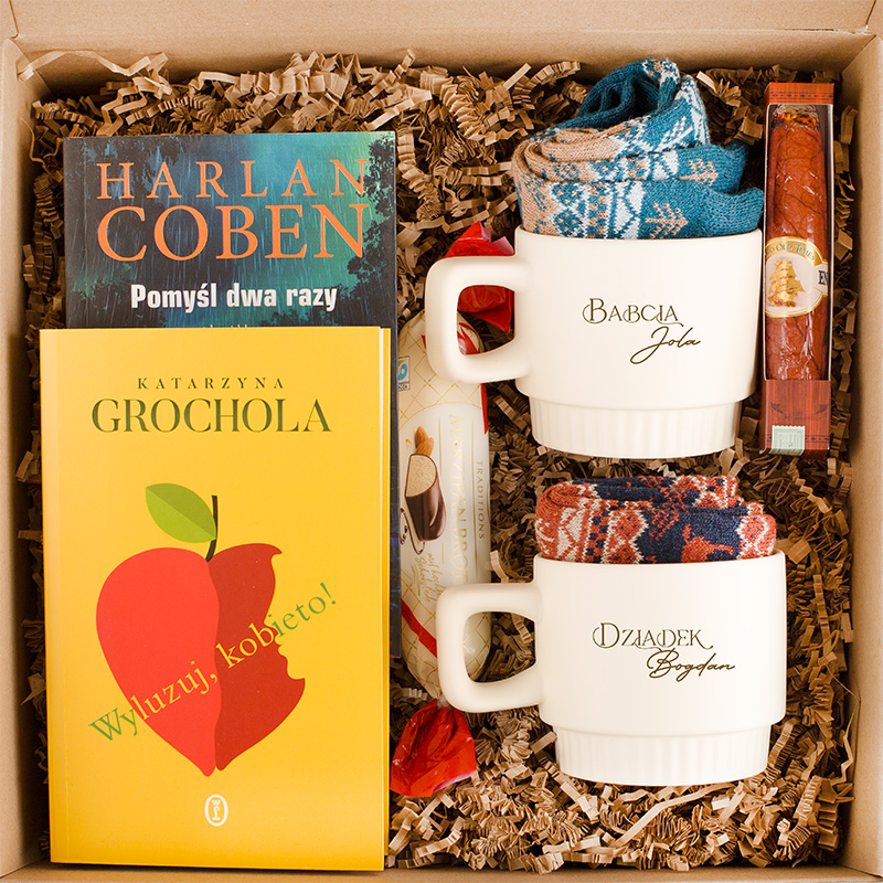 W pudełku znajduje się para kubków ryflowanych z personalizacją, opatrzonych napisami: Babcia [imię] i Dziadek [imię]. Do zestawu dołączono także dwie książki – jedna autorstwa Katarzyny Grocholi, a druga Harlana Cobena. To idealne połączenie dla miłośników literatury obyczajowej i sensacyjnej. Komplet uzupełniają ciepłe, kolorowe skarpetki oraz czekoladowe cygaro i baton marcepanowy, które dodają nuty słodkości. Całość zapakowana jest w estetyczne pudełko prezentowe, a jego wewnętrzna strona zawiera wklejkę z napisem: Kochani Babciu i Dziadku. Dla Was czas relaksu miły, więc korzystajcie z tej cudownej chwili.