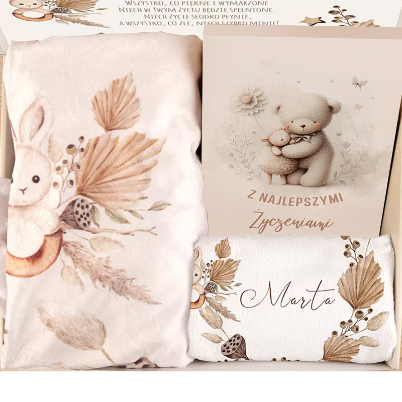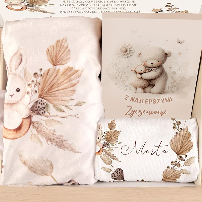 Prezent na narodziny to zestaw, który składa się z miękkiego kocyka, chłonnego ręczniczka oraz ergonomicznych dziecięcych sztućców, które nie tylko są praktyczne, ale także estetycznie wykonane. Każdy element jest udekorowany delikatnymi motywami w stylu boho, takimi jak leśne zwierzęta czy delikatne rośliny. Co więcej, możliwość personalizacji sprawia, że każdy przedmiot staje się unikatowy. Miękki kocyk, zwany foto-kocykiem, posiada imię dziecka oraz datę jego narodzin wypisane elegancką, brązową czcionką. Dodatkowo, na kocyku znajduje się plansza z numerami miesięcy, które można zaznaczać przy robieniu zdjęć dziecka. Ręcznik również zdobią te same grafiki w stylu boho oraz imię maluszka. Natomiast sztućce – widelec, nóż, łyżka i łyżeczka – mają wygrawerowane imię na rękojeściach. Opakowanie dodatkowo ozdobione jest obwolutą z motywem przewodnim zestawu, zwierzątkami oraz napisem Kochanemu Maluszkowi. Na wieczku pudełka widnieje uroczy zajączek na kremowym tle, otoczony polnymi kwiatkami, a pod spodem umieszczony jest tekst Z najlepszymi życzeniami. W środku pudełka znajduje się także dekoracyjna wklejka z życzeniami: