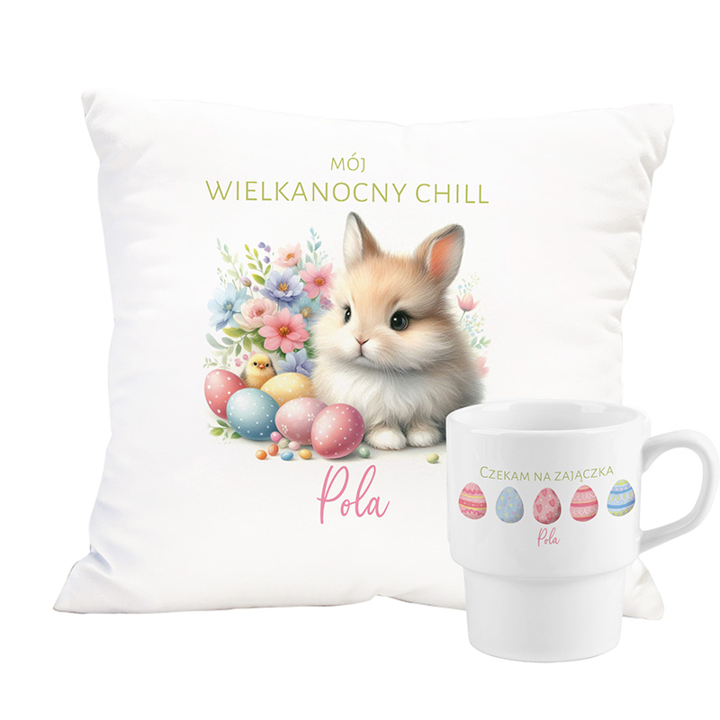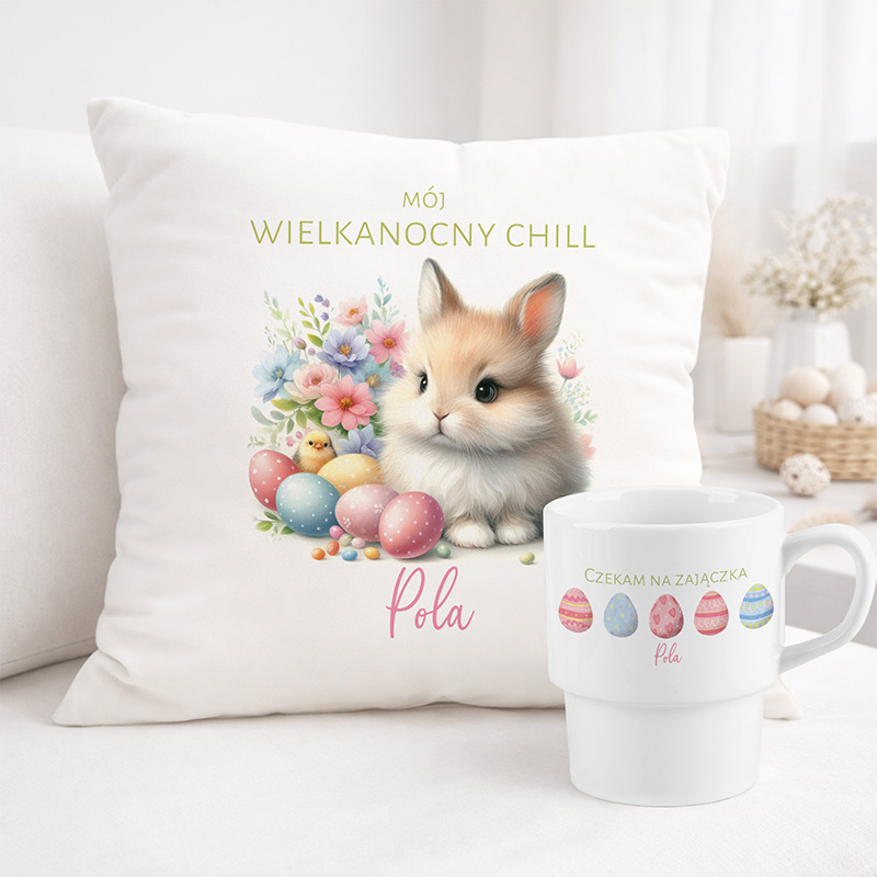 Poduszka z napisem „Mój Wielkanocny Chill” oraz imieniem dziecka staje się wyjątkową ozdobą pokoju, która od razu przyciąga wzrok. Miękka, jasna tkanina doskonale pasuje do wiosennych aranżacji i tworzy przytulny klimat w dziecięcym wnętrzu. Obok niej znajduje się dopasowany kubek z napisem „Czekam na Zajączka” oraz kolorowymi pisankami, który idealnie sprawdzi się podczas picia kakao, herbaty lub ulubionego napoju.