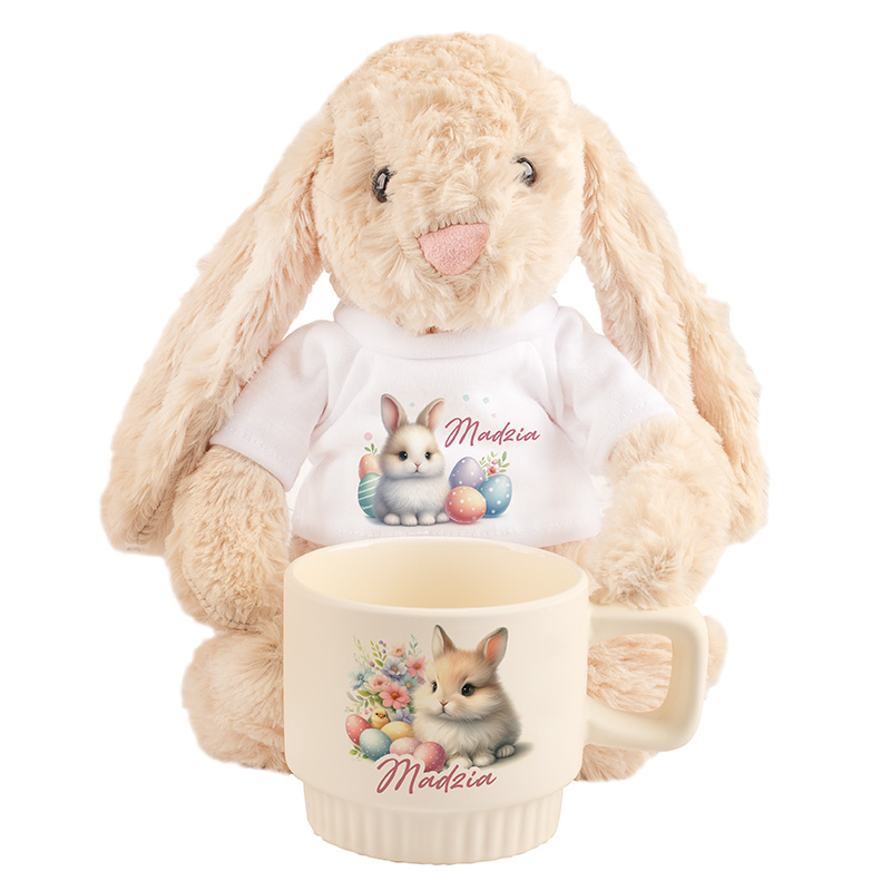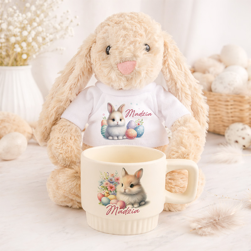 W zestawie znajduje się miękki, puszysty zajączek ubrany w koszulkę z uroczą wielkanocną grafiką oraz kremowy kubek ryflowany ozdobiony motywem słodkiego króliczka. Na kubku oraz koszulce maskotki umieszczone jest imię dziecka, które podlega personalizacji, dzięki czemu prezent staje się wyjątkowy i przygotowany specjalnie dla małego właściciela. Delikatna kolorystyka i bajkowa ilustracja sprawiają, że zestaw prezentuje się niezwykle ciepło i dziecięco.